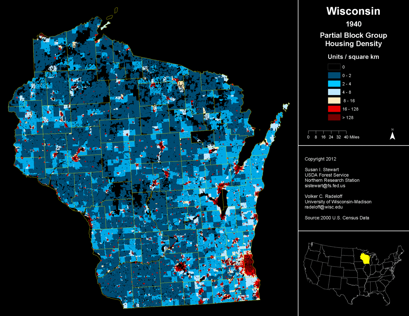 Information about housing densities at fine spatial scales is critical to understanding how human development impacts species of interest. However, available data is at the county level, which is too large a scale for most ecological studies. Nick Keuler, statistician for the SILVIS lab, and Roger Hammer at Oregon State University are using Bayesian statistics to project housing densities into the past and future at smaller units of scale, called partial block groups (PBGs).